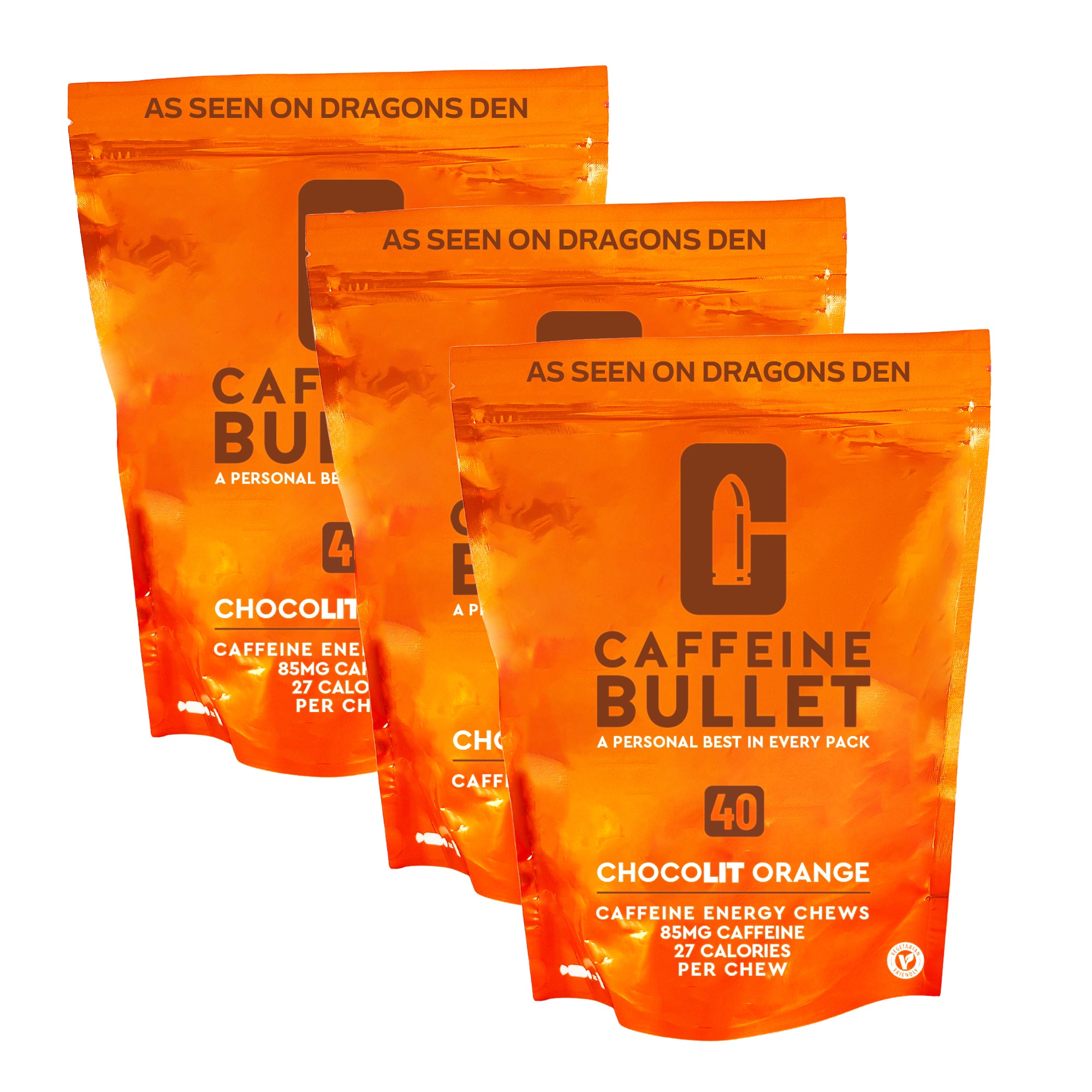 Each Chocolate Orange Caffeine Chew contains 85mg caffeine (a strong cup of coffee) and kicks faster than energy gels.