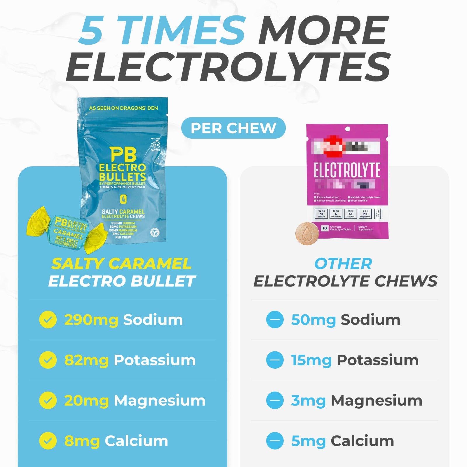 Unlike drinks or powders, these convenient salted caramel electrolyte chews need no mixing or liquids, meaning instant and more efficient hydration. Electro Bullets work within minutes, ensuring you stay at your best and turning every moment into a chance to hit your Personal Best.
