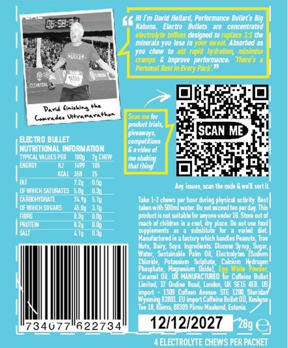 Push your limits without fear of seizing up at the worst moment. Each chew also contains 20mg of magnesium and 8mg of calcium to maintain optimal muscle function, Electro Bullets ensure your muscles continue to perform at their best - No cramps, just PBs!